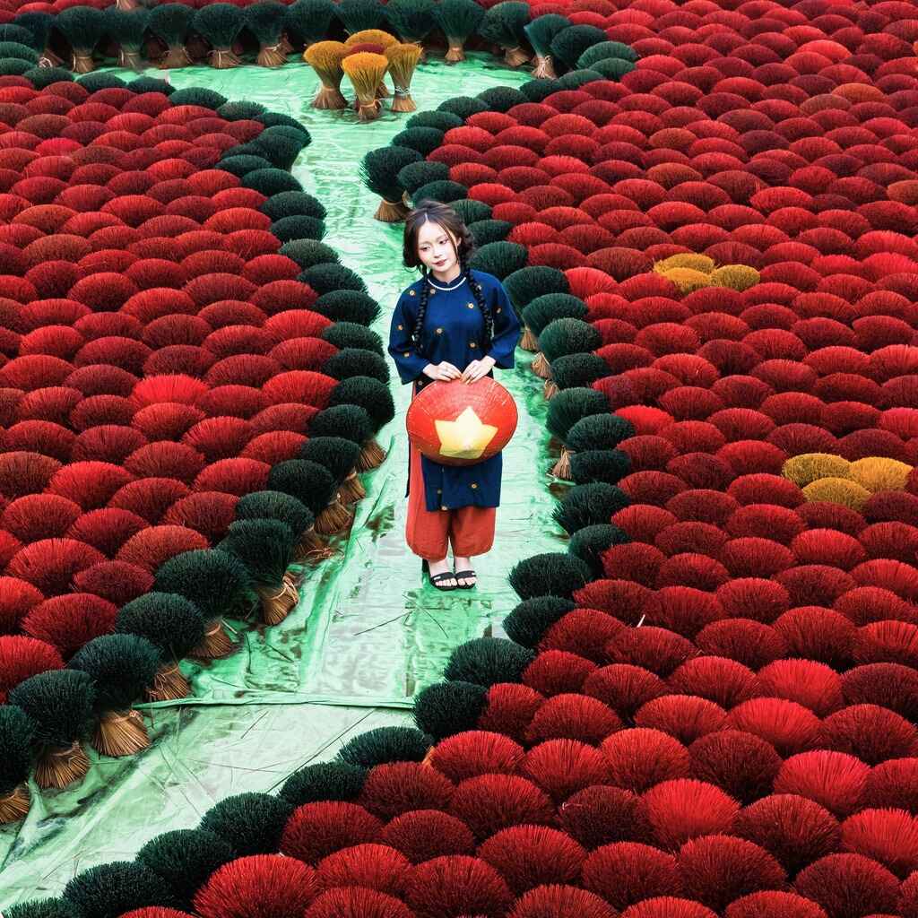 Ngoài những bó hương được xếp ngay ngắn dưới sân, chúng ta còn có thể check in trên những giàn hương đã được các cô chú xếp lên một cách cẩn thận.