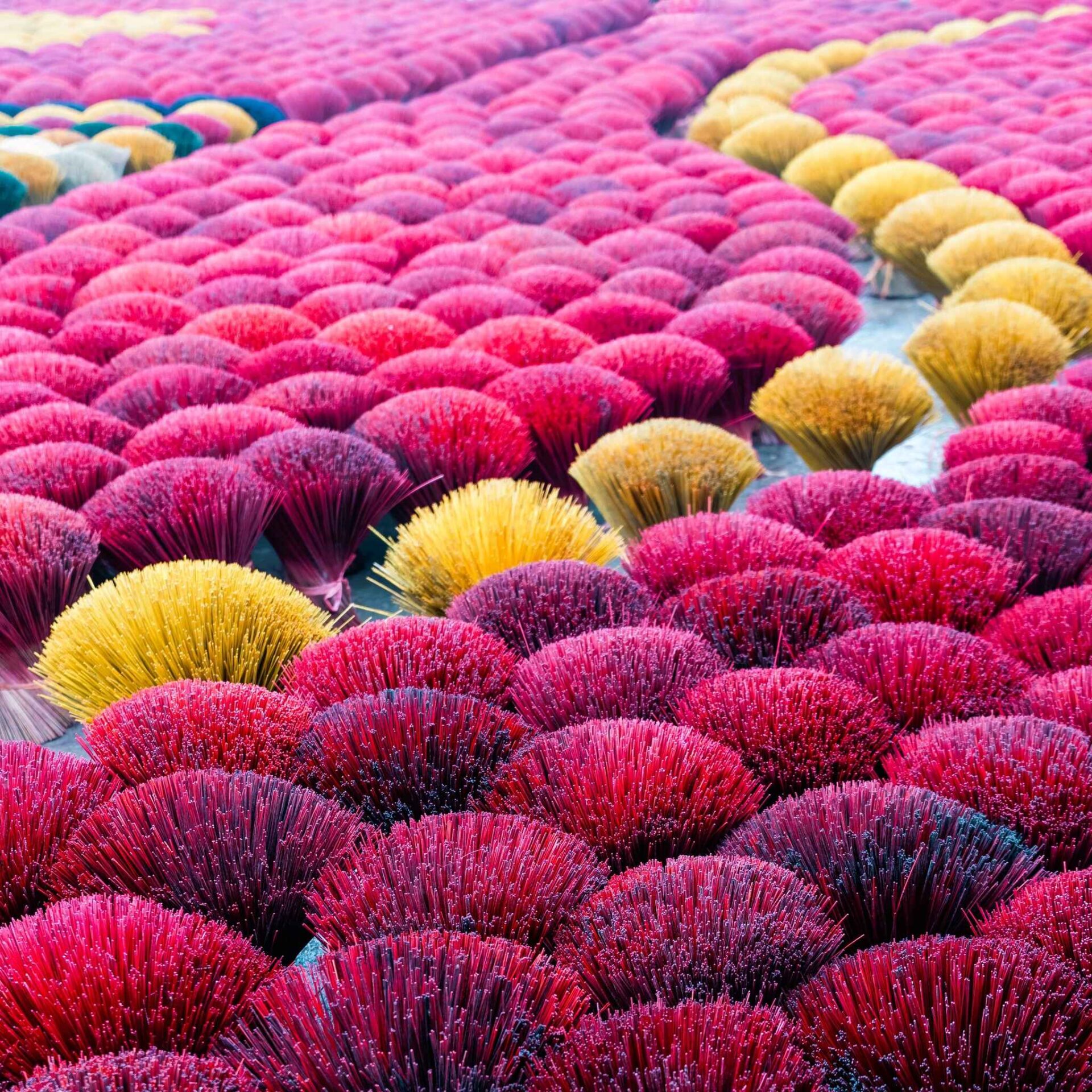 Hình ảnh đặc trưng của làng là những bó tăm hương xanh đỏ tím vàng phơi khắp nơi, tạo thành những bức tranh sống động và đẹp mắt.